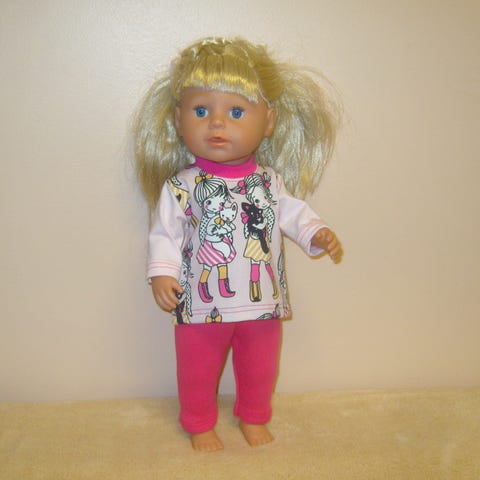 43 cm nukelle (baby born tai sister) trikoosta pallollinen paita, jossa takana pukemista helpottava tarrakiinnitys. Housuissa vyötäröllä kuminauha.