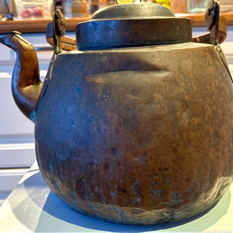 Tosi vanha, kauniisti ajan patinoima, käsin taottu kuparipata jalustalla