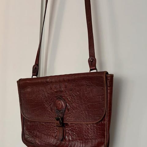 Paksua mustaa vähän krokotyylistä nahkaa. Menee myös olalle. Sisällä tasku. Vetoketjullinen. Koko n. 33*29*6 cm.