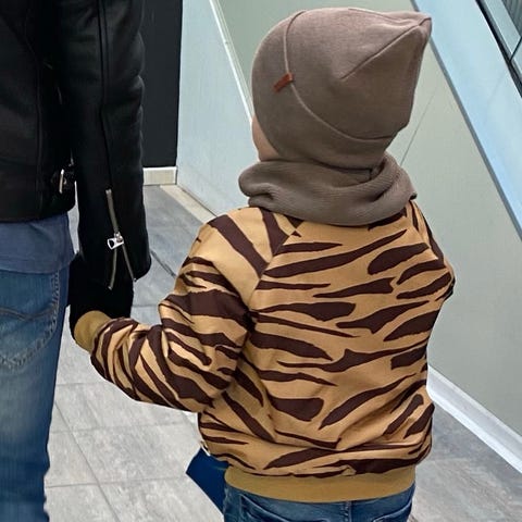 Mini Rodini lasten bomber-takki. Vaaleanpunainen päällinen ja kiiltävä vuori. Edessä vetoketju ja painonapit, sivuilla taskut. Takana suuri dinosaurusaiheinen kuvio. Sopii arkeen ja kevyeksi päällystakiksi lapselle.