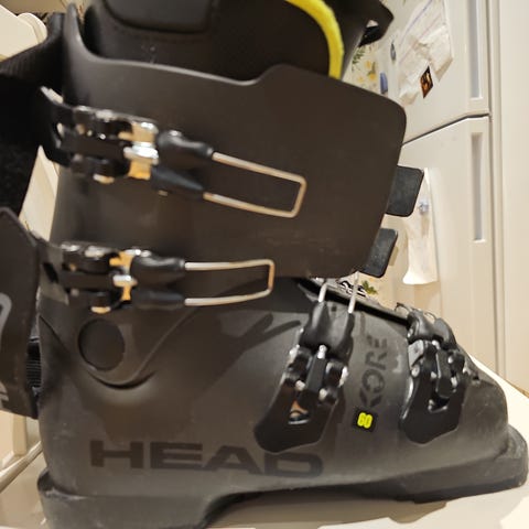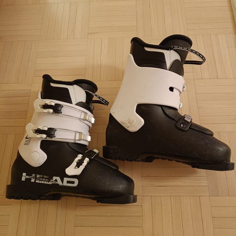 Head Raptor 60 laskettelumonot, koko 21.0–21.5 MP. Väri valkoinen turkooseilla ja mustilla yksityiskohdilla. Neljä säädettävää solkea ja tarrakiristys varmistavat istuvuuden. Monot soveltuvat alppihiihtoon ja niissä on kumipohja kävelyä varten. Raptor 60 -malli on suunniteltu nuorille laskijoille, jotka tarvitsevat tukevan ja napakan monon rinteeseen. Lapsen jalan koko on ollu n. 34