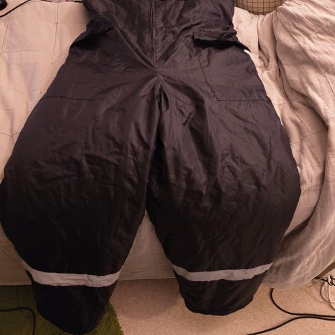 Vihreät sadehousut, joissa lahkeissa heijastinnauhat. Housut on valmistettu vedenpitävästä materiaalista ja soveltuvat käytettäväksi sateisella säällä ulkoillessa. Malli on suora ja lahkeet ovat pitkät.