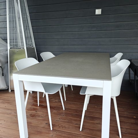 - 3-osainen bistrosetti: 1 pyöreä pöytä ja 2 tuolia- Veistetty puinen muotoilu on tyylikäs ja tyylikäs, ja se kuivuu nopeasti sateen jälkeen- Täysin alumiinirunko kestävyyttä ja vakautta varten- Ihanteellinen puutarhoihin, parvekkeisiin ja aamiaisnurkkauksiin- Sateenvarjon reikä pöydän keskellä sateenvarjolle, jonka tangon halkaisija on Ø42mm tai Ø38mm- Asennus vaaditaan