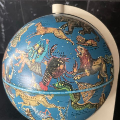Vanha tähtikuviokarttapallo. Muovi/metalli.