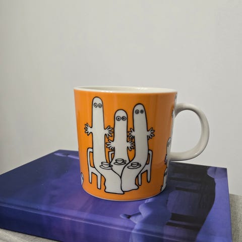 Tarrallinen muumimuki. Muki on käyttämätön eikä siinä ole naarmuja tai kolhuja.