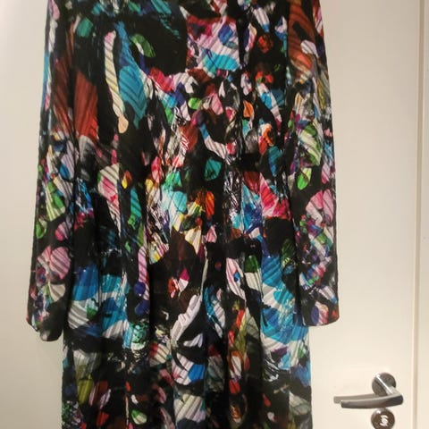 Aino arkimekko, naisten koko XL. Mekossa on monivärinen, kirjava ruutukuosi tummalla pohjalla. Materiaalina pellava, joka on hengittävä ja kevyt käytössä. Hihaton malli, pyöreä pääntie. Sopii arkikäyttöön ja kerrospukeutumiseen esimerkiksi neuletakin tai takin kanssa.