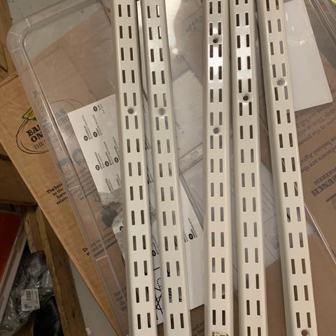 Metallinen hyllyjärjestelmä, johon kuuluu pystykiskoja ja metallisia hyllytasoja. Pystykiskoissa on valmiit reiät hyllyjen korkeuden säätöä varten. Soveltuu esimerkiksi varaston tai kellarikomeron hyllyjen rakentamiseen tai täydentämiseen. Mitat ja tarkka kappalemäärä eivät käy ilmi kuvista.