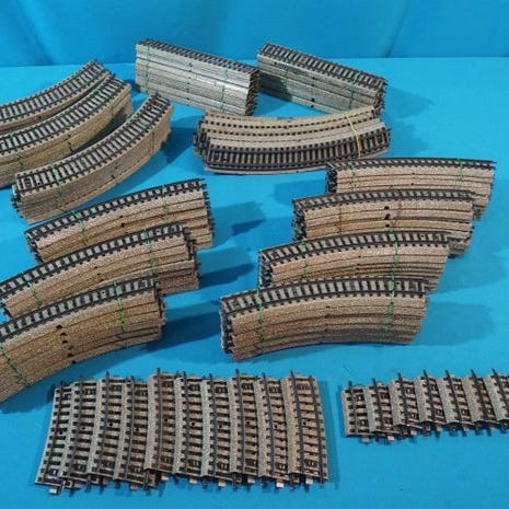 115-osainen M-rail-erä30x 5106 suora, laatikossa14x 5107 suora, lyhyt, 1 kpl laatikolla15x 5110 suora2x 5108 suora8x 5100 taivutettu25x 5101 taivutettu lyhyt1x 5201 taivutettu lyhyt10x 5102 taivutettuErittäin hyvässä kunnossa, osin alkuperäispakkauksella.Joissakin raiteissa esiintyy kevyitä urajälkiä.Kuvista saa käsityksen.
