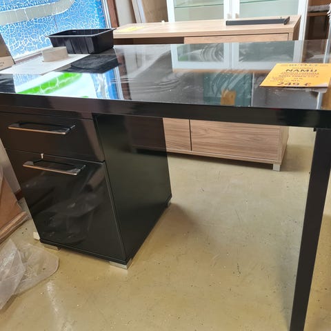 Laulumaan puinen työ/kirjoituspöytä jossa irtonainen yläosa. Korkeusmitta otettu sen korkeimmasta kohtaa 101cm. Itse pöydän korkeus on 72cm. Kannen alla vedettävä lisätaso. Mäntyä.