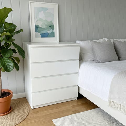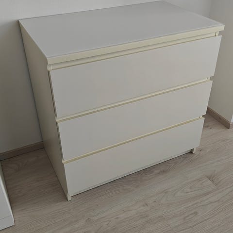 Tason päällä lasilevy. Oikean puolen laatikoston yläosasta puuttuu poikkipuu