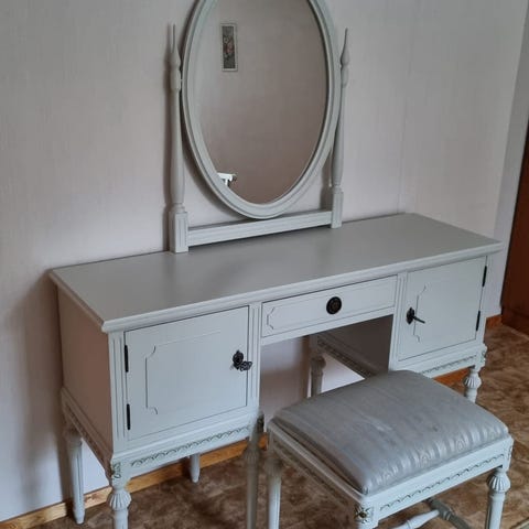 Kampauspöytä 250€. Hyvä kuntoinen pöytä ehjällä peilillä ja yksi lukittava laatikko avaimella. Syvyys 37cm, Korkeus 70cm ja leveys 120cm