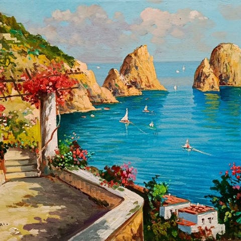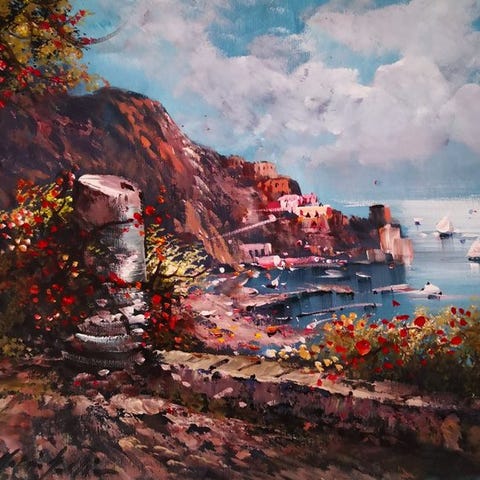 Upea ja erittäin kaunis öljy kankaalle 40 × 50, mestari Grimaldi, joka kuvaa upean Costieran kulman kalastajien veneineen ( Upea ).Kauniita värejä, huomataan erinomainen maalaustaito. Alla on taiteilijan allekirjoitus.Peräisin yksityisomistuksesta ja seurattava lähetys.