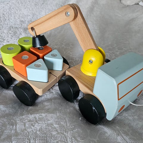 Lasten lelutrukki jonka puomi liikkuu ylös ja alas, käytönjälkiä on mutta toimii ihan ok hyvin
