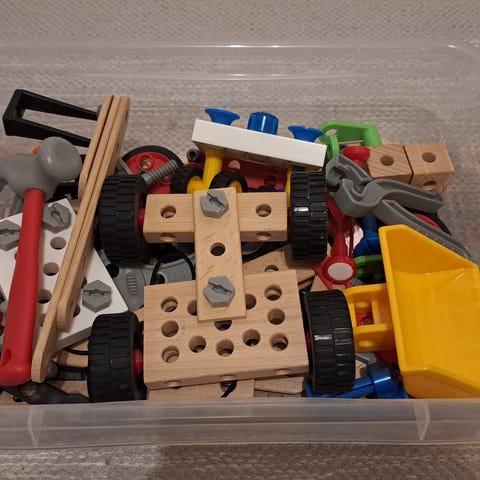 Mukana useita erilaisia rakennusosia, työkaluja ja tarvikkeita, puisia ja muovisia palikoita, reikälevyjä, ruuveja, muttereita, renkaita, akseleita sekä pieniä lisäosia eri väreissä.