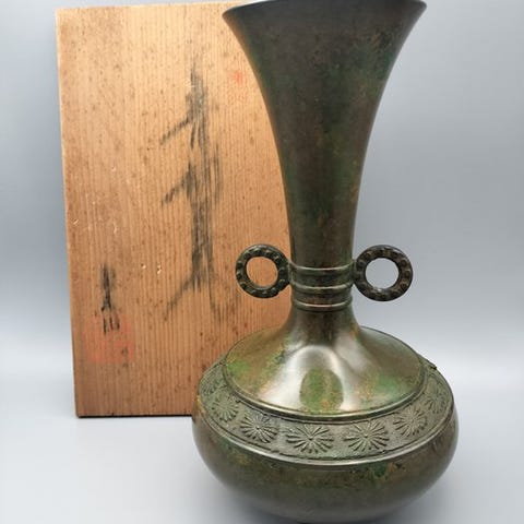 Tämä vaikuttava pronssimaljakko features a powerful form and refined relief decoration, yhdistäen klassisen Itä-Aasian symboliikan sekä japanilaisen Showa-kauden käsityön.Maljakolla on korkea, elegantti siluetti tom tutumm, levenevä suu ja pyöristetty alaosa. Molemmin puolin nousevat veistetyt kahvat tyylitellyistä lohikäärmepäistä, joiden pitkät muodot kaartuvat alaspäin hillityn dynaamisen liikkuvuuden kanssa. Keskimmäisen rungon ympärillä kulkee jatkuva relieppivyö, jossa on arkaaiset motiivit kuten lohikäärmeet, pilvikuviointi ja geometrian ukkospalvaskuvioita, jotka ovat inspiroituneet muinaisen kiinalaisen pronssikoristelun mukaan.Pinta esittää rikkaan monivärisen patinan syvissä ruskean, vihreän ja punaruskean sävyissä, mikä on seurausta tarkoituksellisesta kemiallisesta viimeistelystä ja luonnollisesta vanhenemisesta. Yleinen ilme on arvokas ja massiivinen, painoa hieman yli kilon.Perustuen tyylisiipeihin, valutekniikkaan ja patinaan, maljakko ajoitetaan 1950–1975-lukujen mid Showa -kauteen (昭和中期). Vaikka merkintää valmistajasta ei ole näkyvissä, käsityön laatu ja koristeellinen sanasto muistuttavat vahvasti Takaokan, Toyama Prefektuurin, Japanin tärkeintä pronssinvalanta-keskusta Edo-kaudelta lähtien. Siksi se liitetään Takaoka-tyyliseen pronssityöpajaan.Tämä teos toimii kauniisti koriste-esineenä jopa ilman kukkia ja soveltuu myös vaikuttavaksi ikebana-astiaksi.KokoNoin 23 × 12 × 11 cmPaino: noin 1095 gKunto: (katso yksityiskohdat valokuvista)- Tämä on vintage/edeltäpäin käytetty kappale.- iän ja aiemman käytön vuoksi voi olla kulumaa, naarmuja, tahroja, värin muutoksia tai rypistymiä.- Huomaa, että vintage-kappaleilla saattaa olla tunnusomainen tuoksu pitkäaikaisen säilytyksen tai käytettyjen materiaalien vuoksi. Herkkyys tällaisille tuoksuille voi vaihdella henkilöittäin ja maittain.- Pyrimme kuvailemaan kunnon mahdollisimman tarkasti, mutta havainnot voivat poiketa yksilöllisten standardien mukaan.- Värit voivat näyttää hieman erilaisilta näytön tai valaistuksen vuoksi, kun valokuvia on otettu.- Osta vain, jos ymmärrät ja arvostat vintage-kappaleiden ainutlaatuisia piirteitä.ToimitusErikseen valittava laatu pakataan huolellisesti ja lähetetään pääosin Japan Postin tai DHL:n mukaan tilanteen mukaan. Lähettää Japaniin, joten vastaanottoon kuluu noin 2–3 viikkoa normaalisti.Ymmärräthän, että käytämme kierrätettyjä materiaaleja (kartonki, vanhat sanomalehdet jne.) mahdollisimman paljon pakkausmateriaaleina ympäristön suojelemiseksi.Tuotteen hinnan tai toimituskulujen yhteydessä ei sisälly maahantuontiverot, maksut tai muut maksut. Nämä vastuullistuvat ostajalle.Joskus tullivirkailija tai toimitusyritys maassasi ottaa sinuun yhteyttä tullauksesta puhelimitse tai sähköpostitse. Varmista, että voit vastata heidän yhteydenottoonsa. Jos et vastaa, paketti palautetaan ja aiheuttaa kaksinkertaisen uusintalähetyksen kustannukset.Kiitos yhteistyöstäsi.