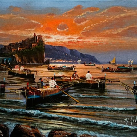 Upea öljymaalaus kankaalle, kooltaan 30 x 40, mestarilta Vincenzo Somma, napolilainen macchiaiolo-maalari (rakastaa maalata rannikkomaisemia, merimaisemia, maaseutumaisemia ja ei vain. Hänen teoksensa ovat sekä julkisissa että yksityisissä kokoelmissa Italiassa ja ulkomailla. Maalari, jolla erinomainen maalaustaito. Esittää upeaa Capriä ja sen Faraglioni-kivimuureineen sekä veneineen ja henkilöineen, ja erittäin kaunis meri on mestarillisesti toteutettu.) Huomataan taiteilijan erinomaisen ja herkkä käsialan, jossa hän käyttää kirkkaita värejä, materiaalisia ja päättäväisiä sävyjä luonnollisesti ja tarkasti, mikä tekee teoksesta harmonisen ja elegantin. Takana signeeraus ja lyhyt biografia sekä aitoustodistus ja teoksen valokuva, jonka taiteilija on tehnyt. Peräisin yksityiskokoelmasta ja seurattavissa oleva toimitus.