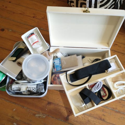 Pieni ompelupakkaus, jossa on sakset, mittanauha, neuloja, nuppineuloja, lankoja useissa väreissä, neulalankain, nappeja ja hakaneula. Setti on pakattu pieneen koteloon, joka sopii mukaan laukkuun tai matkoille hätäkorjauksia varten.