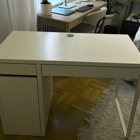 Valkoinen Ikean Micke-työpöytä. Oikein hyvässä kunnossa muuten, mutta pöytälevyssä on pieni kolhu, joka peitetty valkoisella teipillä. Tarkat mitat kuvassa.