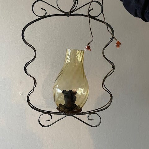 Rungoltaan siistikuntoinen, Lauttasaaren Metallivalmiste Oy:n valmistama vanha kattovalaisin. Korkeus n. 65 cm ja leveys 55 cm. Kolme ehjää kupua, yhdestä pala pois.