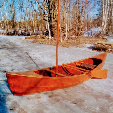 Ally kasattava kanootti. Pohjassa paikat kolmelle pienelle reiälle. Hyvä, kevyt ja ketterä. Toinen penkki puuttuu kuvista.