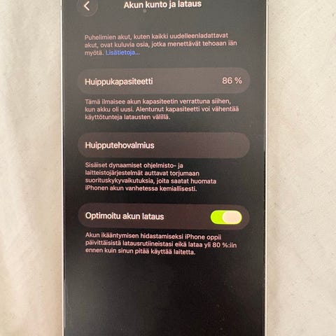 Ostettu toukokuussa 2023 ja ollut käytössä heinäkuuhun 2025 asti. Akun huippukapasiteetti 86%. Moitteeton kunto, ainut vika jonka löysin on alareunassa oleva pieni särö. Lisäksi latausportti kaipaa puhdistusta