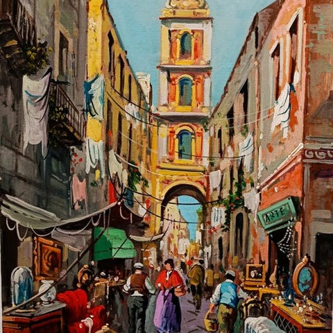 Öljymaalaus kankaalle 24 x 30, mestari Salvatore Montella (1949), napolilainen taiteilija, jolla on sekä kansallinen että kansainvälinen maine. Hänen teoksiaan on sekä Italiassa että ulkomailla. Tunnettu Napolin ominaisiin kujien maalauksena ja ei vain. Kuvassa on tyypillinen kansankuva, markkinatori Napolissa (borgo marinaio Napoli) useine hahmoineen. Todella kaunis teos. Mestari kuvaa upeasti Napolin tyypillisiä kansankuvia. Pakkauksen varmistetaan turvallisesti ja ammattitaitoisesti. Huomattavaa on erinomainen maalaustaito. Takakannella taiteilijan allekirjoitus. Lähtöperä: yksityiskokoelma ja toimitus, jonka voi seurata.