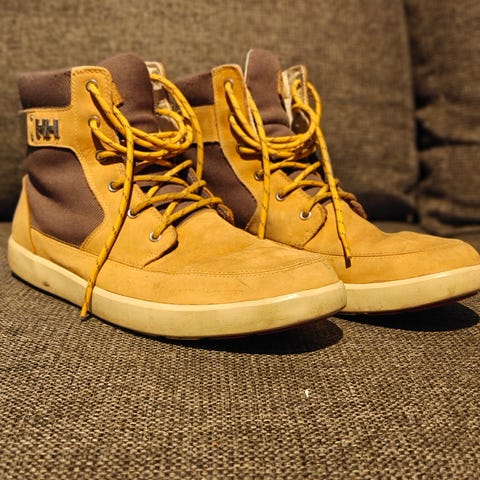 Helly Hansen talvikengät, koko 46. Varren mittaiset nauhalliset kengät, ruskea päällinen ja vaalea kumipohja. Päällinen waterproof kangasta ja sisäosa pehmustettu lisämukavuutta varten. Sopivat kylmempiin keleihin arkikäyttöön. Malli kapeahko.