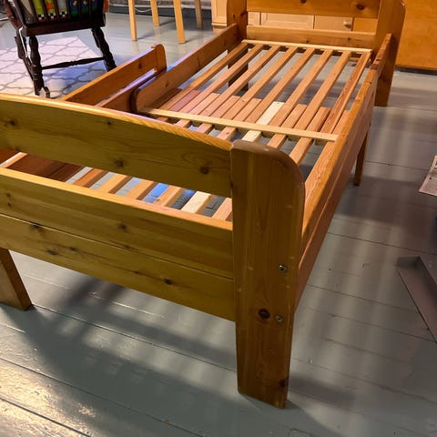 Jatkettava juniorisänky. Materiaalina lakattu puu, jossa näkyvissä puunsyyt ja oksankohdat. Sängyssä on laidat osittain reunoilla ja vanerinen pohjalevy patjalle. Sopii lapsen ensimmäiseksi omaksi sängyksi pinnasängyn jälkeen. Mitat ja patjakoko eivät käy ilmi, joten ne on hyvä mitata erikseen paikan päällä.