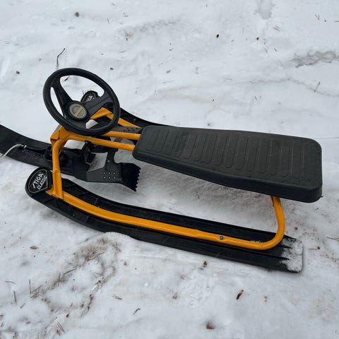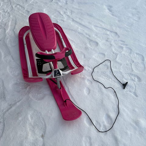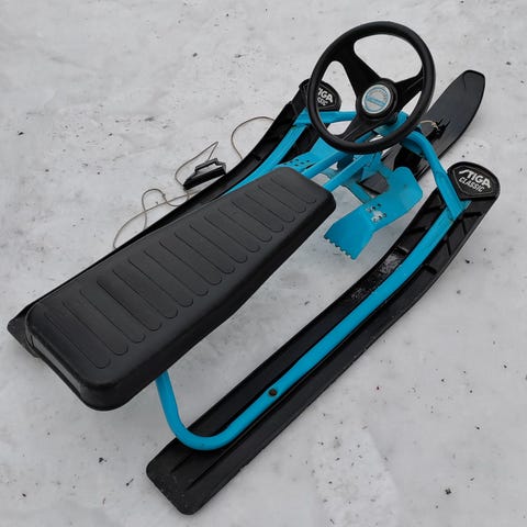 Stiga rattikelkka lapsille. Kelkassa on ohjauspyörä ja jalkajarru.