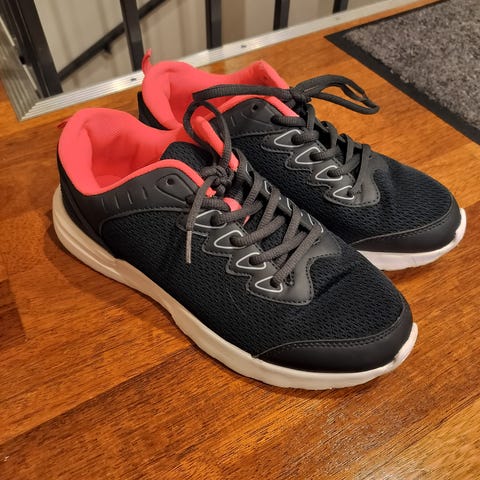 Vaaleanpunaiset nauhalliset kengät, joissa verkkomainen päällinen ja valkoinen pohja. Sopivat arkeen ja kevyeen liikuntaan.