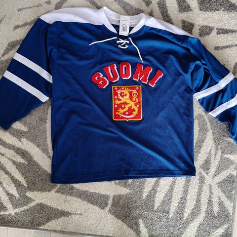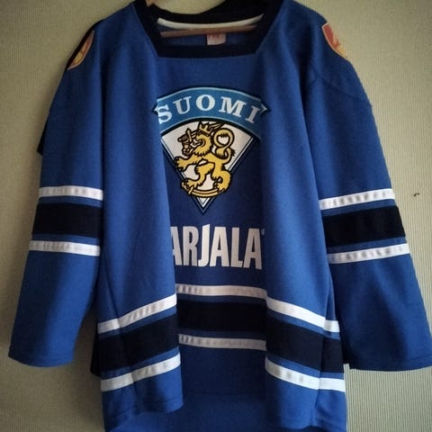 Knitwear jääkiekko pelipaita sininen vihreillä kaulus- ja logo‑yksityiskohdilla. Edessä ja takana vihreä Tekla‑teksti sekä suuri numero 3 selässä. Paidassa pitkät hihat ja helmassa valkoiset raidat. Sopii jääkiekkoharrastukseen tai fanipaidaksi. Pituus olalta helmaan 77 cm, kai-kai 64 cm. Nouto Veräjämäestä tai voin lähettää Toridiilillä.