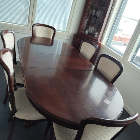 Todella siisti ja näyttävä kokonaisuus. Jatkettava pöytä +100cm ja 8kpl tuoleja joista kaksi ns isännän ja emännän kuvioilla.