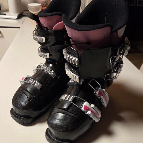 Rossignol Lange Axium X1 laskettelumonot. Väri musta hopeilla ja punaisilla yksityiskohdilla. Neljä solkea ja tarrakiristys varressa. Pohjan pituus merkitty 325 mm. Vastaa noin kokoa 43.