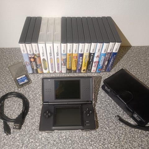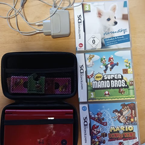 Two Nintendo DS'. The last time I used them, the red one had a problem with the upper screen. The blue one worked. I couldn't test them, however, because I don't have the right power supplies. That is why I sell them for parts.