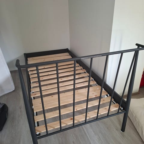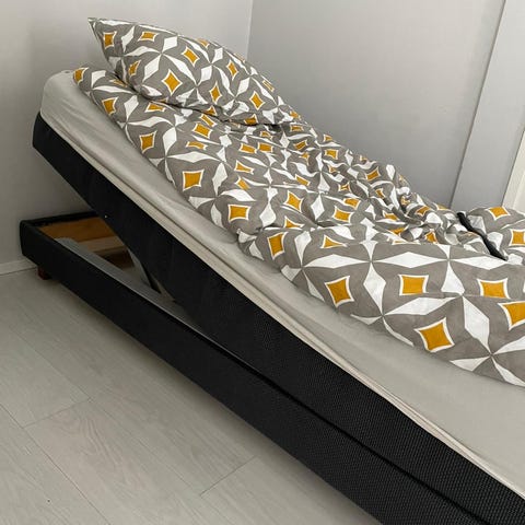 Sähkösänky, jossa moottoroitu säätö pää- ja jalkopäähän kaukosäätimellä. Vuoteen leveys on arviolta noin 90 cm ja pituus noin 200 cm. Runko on verhoiltu harmaalla kankaalla. Päällä on valkoinen petauspatja, jossa musta reunus, sekä erillinen valkoreunainen päällinen. Sopii yhdelle nukkujalle esimerkiksi makuuhuoneeseen tai vierashuoneeseen, kun halutaan säätää nukkuma-asentoa erikseen selän tai jalkojen tueksi.