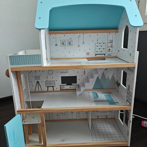 Annetaan Ikean leikkikeittiö. Toisesta kaapista puuttuu ovi ja käytönjälkeä on. Keittiötarvikkeet saa myös mukaan.