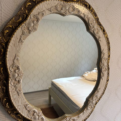 Upea, vanhan tuotannon Talonpoikaisrokokoo seinäpeili myytävänä. Kunto erinomainen. Fasettihiottu peili ehjä ja selkeä. Kehykset siistit. Ripustin löytyy. Tausta aikanaan vaihdettu. Koko 52x135 cm.