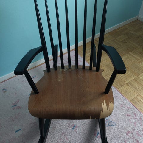 Komea korkealla selkänojalla varustettu 50-luvun musta keinutuoli myytävänä. Runko ja pinnat kaikki tukevia eikä tuoli kitku. Kuluneisuutta käsinojissa sekä jaloissa. Pinnoissa muutamia kolhuja.