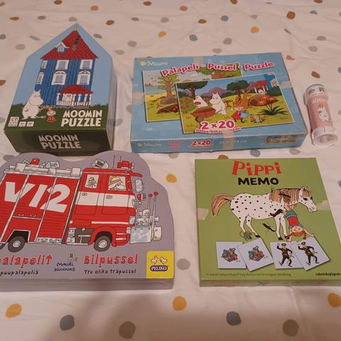 Yhteensä kaksi lautapeliä ja palapeli, jossa kaksi erilaista kuvaa. Klassikoksi noussut ensipeli Hedelmätarha yli 2-vuotiaille. Hyvät tulevat hedelmät ja muut osat. Disney muistipelissä 48 paksua kuvakorttia. Kaikki osat olleet tallella kun viimeksi pelattu.