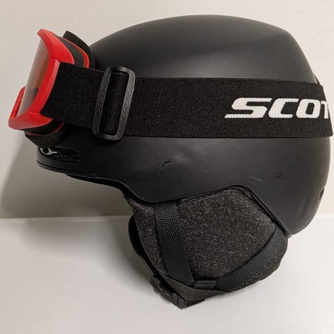 Mukana Cébé-laskettelulasit sinisellä joustonauhalla. Setti soveltuu lasketteluun ja lumilautailuun.