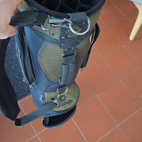 Max X-Way golfbägi jalustalla. Harmaa/oranssi kantobägi, jossa useita vetoketjullisia taskuja tarvikkeille. Bägissä on kaksiosainen olkaviileke helpompaa kantamista varten sekä integroidut tukijalat, joiden avulla bägi pysyy pystyssä kentällä. Mukana erillinen sadesuoja.