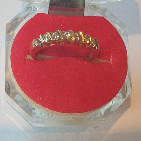 Kultainen naisten timanttisormus paino 3,52g. Sormus on valmistettu kullasta ja siinä on 3 timanttia koristeena. Sopii käytettäväksi esimerkiksi arki- tai juhlasormuksena. Huomioithan, että tarkka karaattimäärä ja timanttien yhteispaino eivät käy ilmi tiedoista. Lappu hukkunut muutossa. Lisään koon heti kun työntömitta löytyy.