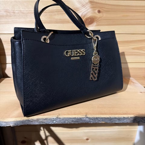 Guess käsilaukku naisille. Materiaalina tekonahka, jossa krokokuosinen pinta ja perhoskoriste edessä. Laukussa on kantokahvat olalla tai kädessä kantamiseen. Sisäpuolella on kuviollinen vuori, vetoketjutasku sekä avoimia taskuja pienten tavaroiden säilytykseen. Suljenta vetoketjulla.