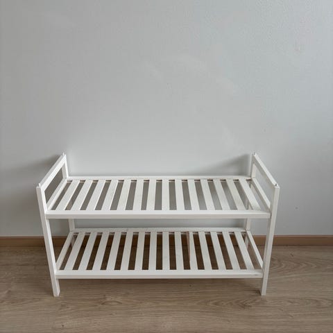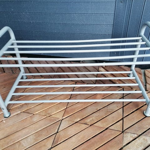 Tukeva kenkäteline nahkapenkillä. Käytetty kunto, nahassa muutamia naarmuja ja pieni reikä. 80 leveä 50 korkea ja 30 syvä.