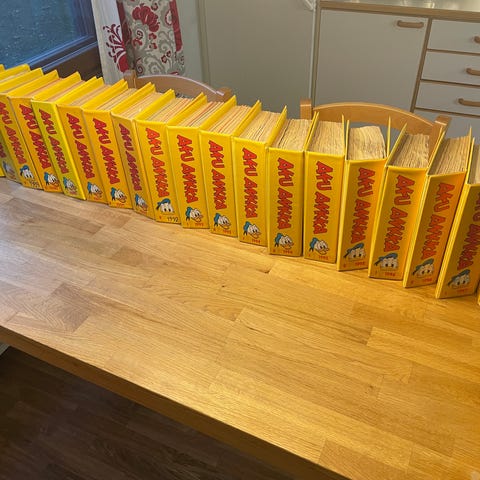 Aku Ankka lehdet kansioissa vuosilta 1989-1996, 8 vuosikertaa, 16 kansiota, kussakin aina puolen vuoden lehdet. Yhden vuosikerran (2 kansiota) hinta 7 euroa. Yksittäin kansiot 5 e/kansio. Pk-seudulle toimitus mahdollinen sopimuksen mukaan, muuten nouto tai postitus, jolloin postikulut ostajalle.