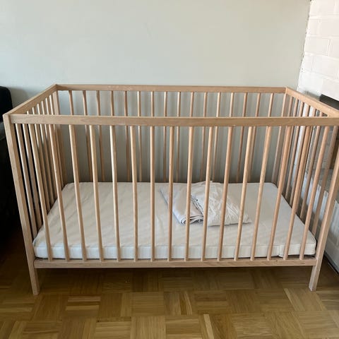 IKEA pinnasänky, puunvärinen. Ollut kahdella lapsella käytössä, yleisilme siisti, jotain kulumaa varmasti löytyy kun tarkemmin etsii, mutta ei hyppää mitenkään silmille. Jonkun verran tullut sävyeroja puuhun, mutta omasta mielestäni ei mitenkään häiritsevästi.
