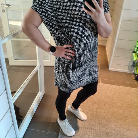 Marimekon naisten tunika , koko M. Materiaalina puuvilla. Musta pohjaväri ja harmaa kukka- sekä pilkkukuosi. Hihat ovat noin 3/4-pituiset ja pääntiessä on nauhakiinnitys. Sopii arkikäyttöön tai rennoksi juhla-asuksi.
