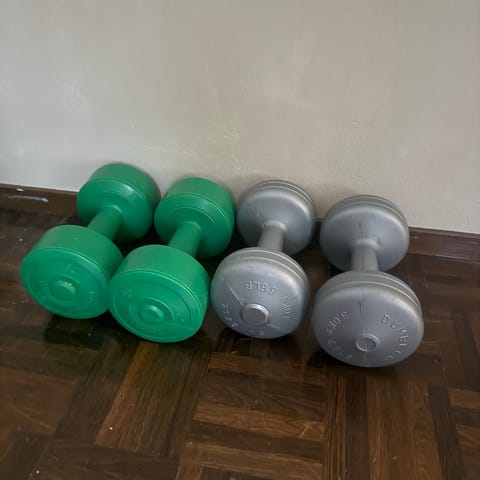 Metallinen käsipaino, jossa mustat pyöreät painolevyt molemmissa päissä. Suora metallinen kahvaosa. Paino on kiinteästi koottu ruuvikiinnityksellä.