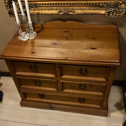 Puinen lipasto, jossa kolme iso laatikkoa ja neljä pientä. Muuten hyvässä kunnossa, mutta tasoilla kulumaa.