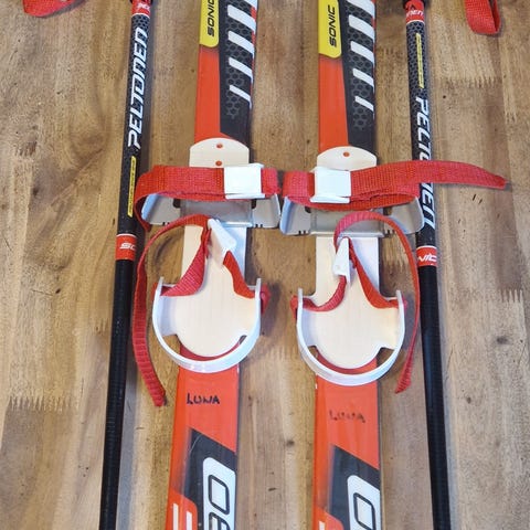 Lasten sukset siteillä ja sauvoilla. Sukset ovat 90 cm pitkät ja soveltuvat lapsille ensimmäisiksi suksiksi. Pohjassa on kuviointi pidon parantamiseksi. Suksissa on säädettävät remmisiteet, jotka sopivat useimpiin talvikenkiin. Mukana tulee 75 cm pitkät sauvat.